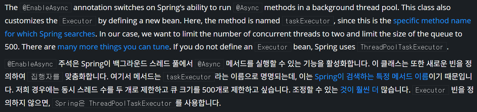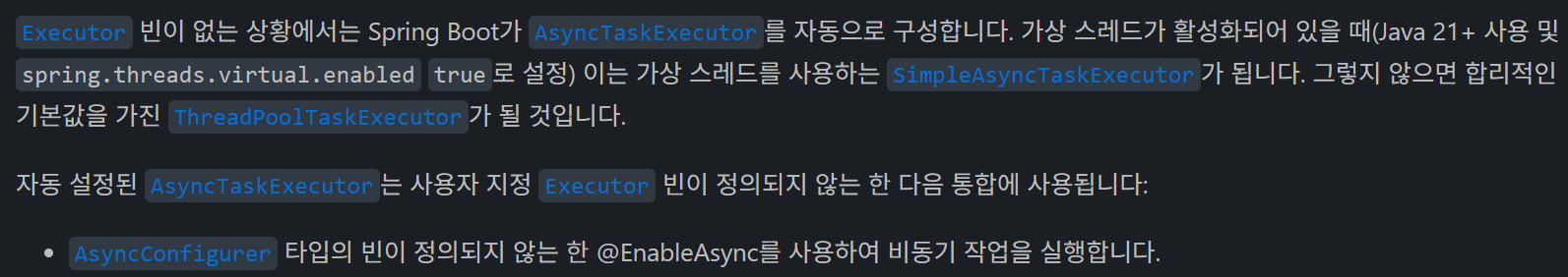 따라서 운영 환경에서는 자동 구성에만 의존하기보다는, 애플리케이션의 특성에 맞춰 ThreadPoolTaskExecutor를 직접 정의하는 경우도 고려해볼 수 있다. 다만 executor 빈은 Spring Boot 전반에 동일하게 적용되는 설정은 아니며 비동기를 사용하는 모듈 별로 사용 방식이 다를 수 있으므로, 실제 적용 범위를 공식 문서를 통해 확인한 뒤 설정하는 것이 좋을 것 같다.